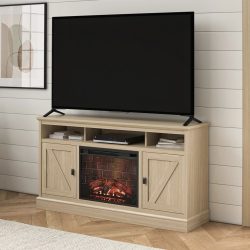 This tv stand includes a 23″ electric fireplace heater with timer function, 11 heat and 4 brightness levels, touchpad display, and realistic LED flame with remote control.