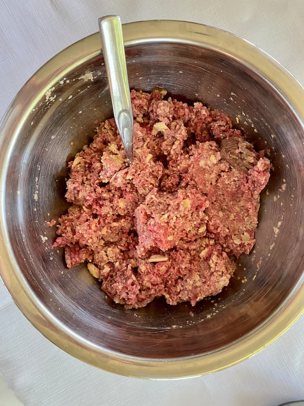 1. In a very large bowl, mix together the ground beef, cracker crumbs, water, salt, and pepper until thoroughly combined.