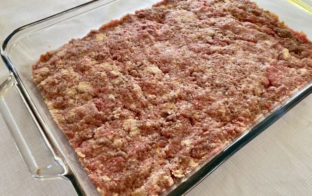 2. Press beef mixture into a jelly roll pan (or a 9×13 pan if you’re only using 2 lbs of meat) and chill until the mixture holds together well. You could even put it in the freezer for a few minutes.
