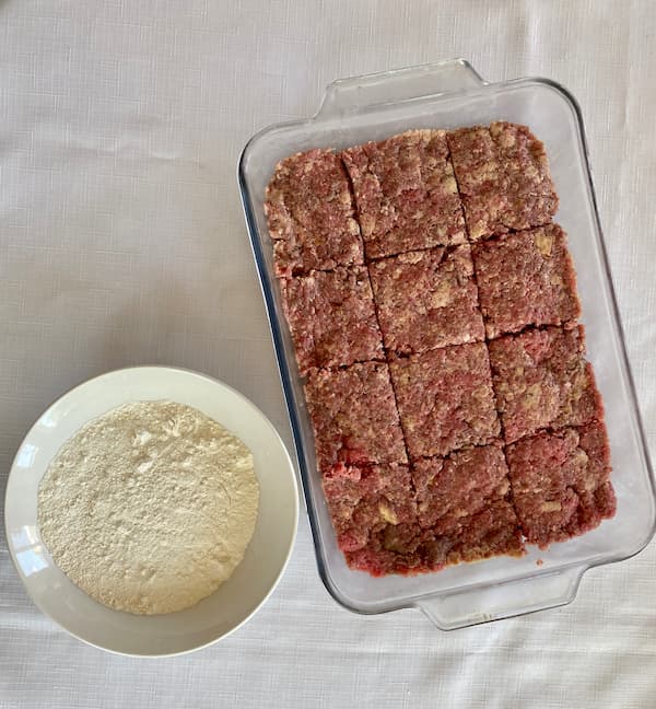 4. Cut chilled meat into squares and coat each square with flour. Set aside.