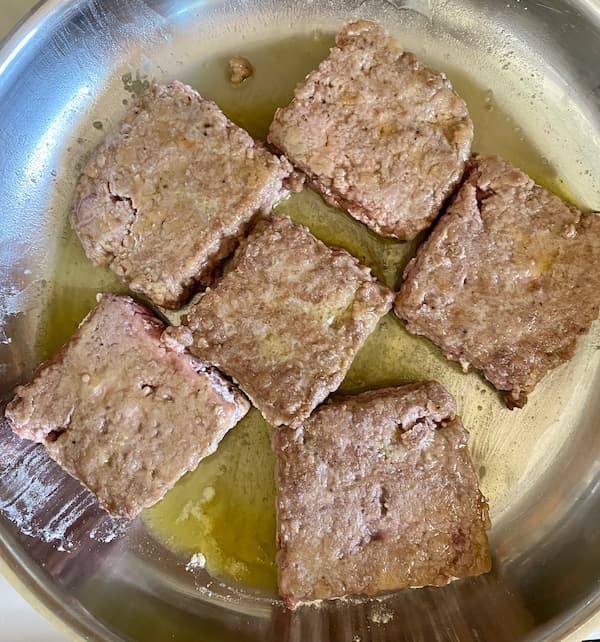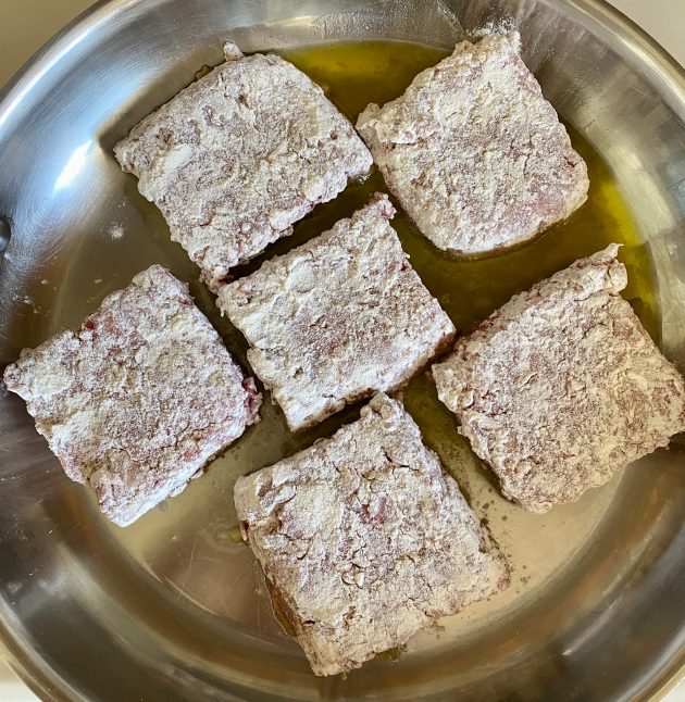 6. Working in small batches, fry a few meat squares at a time, just until golden brown on both sides (but not cooked through).