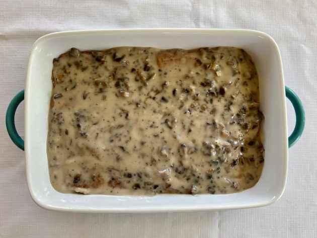 8. Once all squares are fried, pour the cream of mushroom soup over them.