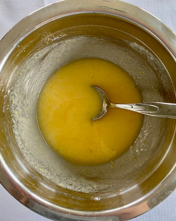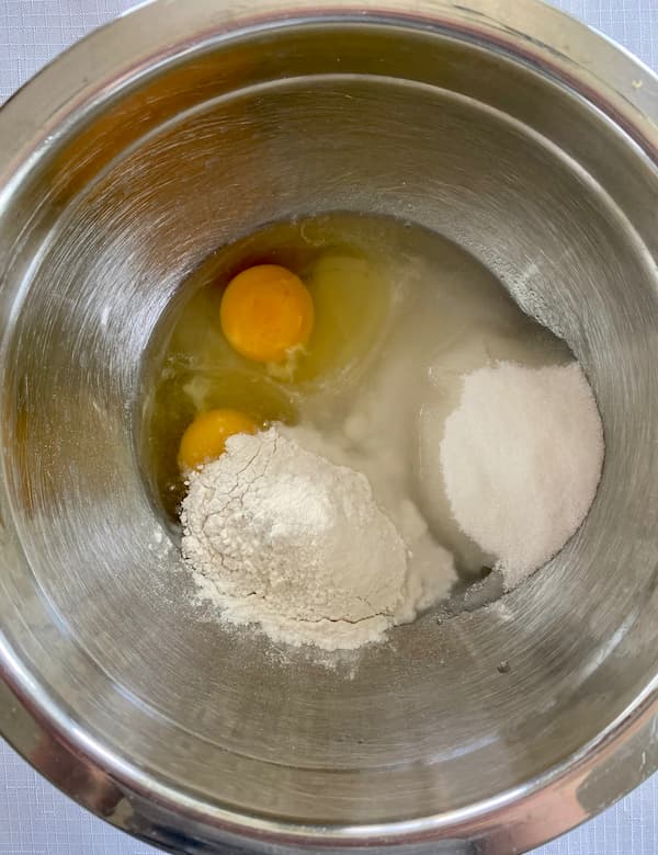 - Meanwhile, combine the eggs, sugar, flour, salt, and vinegar in a mixing bowl and use a whisk to combine.