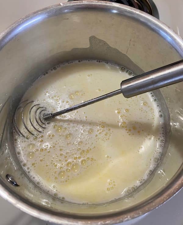 4. Pour the filling mixture into the boiling water and continue to boil, whisking constantly, until mixture thickens. (6-12 minutes, depending on amount of water.)