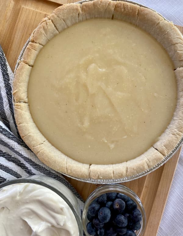 - Well ahead of time, prepare a pie dish with a single crust and pre-bake according to recipe instructions. Allow pie shell to fully cool.