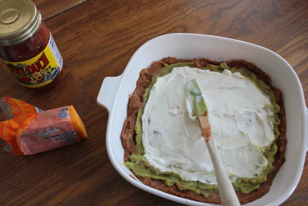 4. Spread sour cream over guacamole.