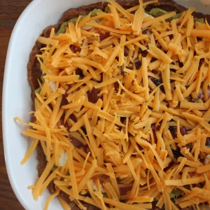 - Spread bean mixture in a 9″ pie plat or similarly sized dish.